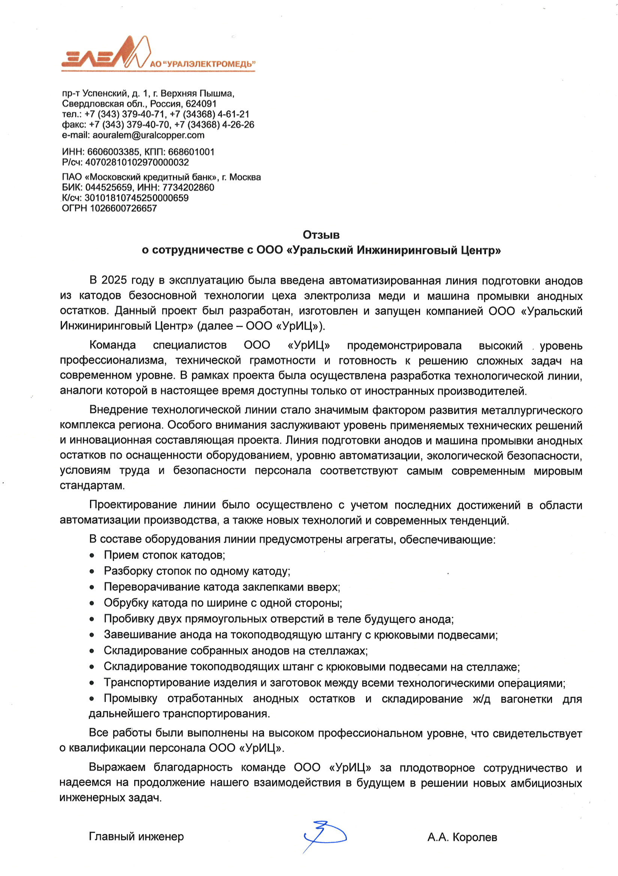 В рамках технического перевооружения цеха медных порошков (далее - ЦМП) компания ООО «УрИЦ» при взаимодействии со специалистами АО «Уралэлектромедь» разработала, изготовила и поставила линию подготовки анодов из катодов безосновной технологии цеха электролиза меди и машину промывки анодных остатков в соответствии с техническим заданием. Новая линия ЦМП впервые разработана и поставлена инженерами Российской компании.