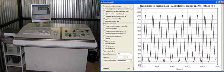 Выбор режима работы стенда, закона изменения давления (синусоидальный или трапецеидальный) в процессе проведения испытания баллона и задание всех необходимых параметров осуществляются оператором.