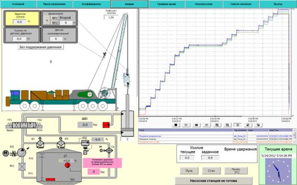 На стендах проводятся испытания по заданным таблицам нагружения в автоматическом режиме поддержания заданного усилия. Создано автоматизированное рабочее место оператора для управления процессом испытания, а также для сбора и хранения диагностической и технологической информации, формирования актов проведенных испытаний.