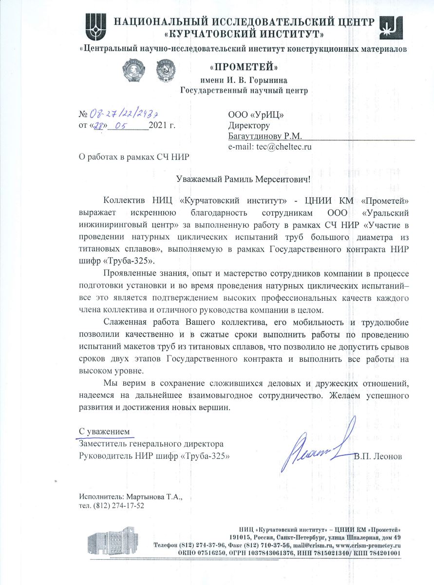 Благодарим за доверие! сотрудников НИЦ "Курчатовский институт" - ЦНИИ КМ "Прометей"