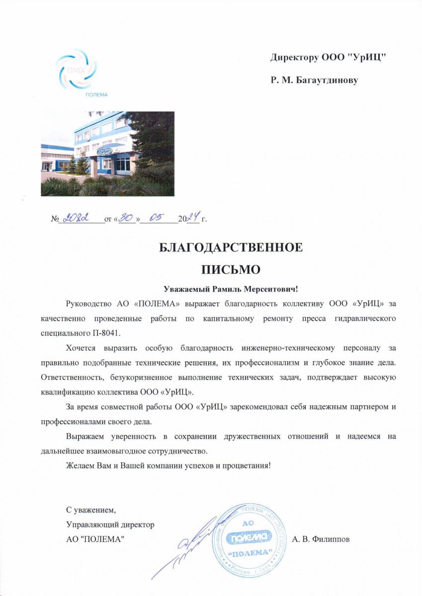 Благодарим за высокую оценку! В АО «ПОЛЕМА» завершён капитальный ремонт и модернизация гидравлического пресса П-8041 металлургического участка