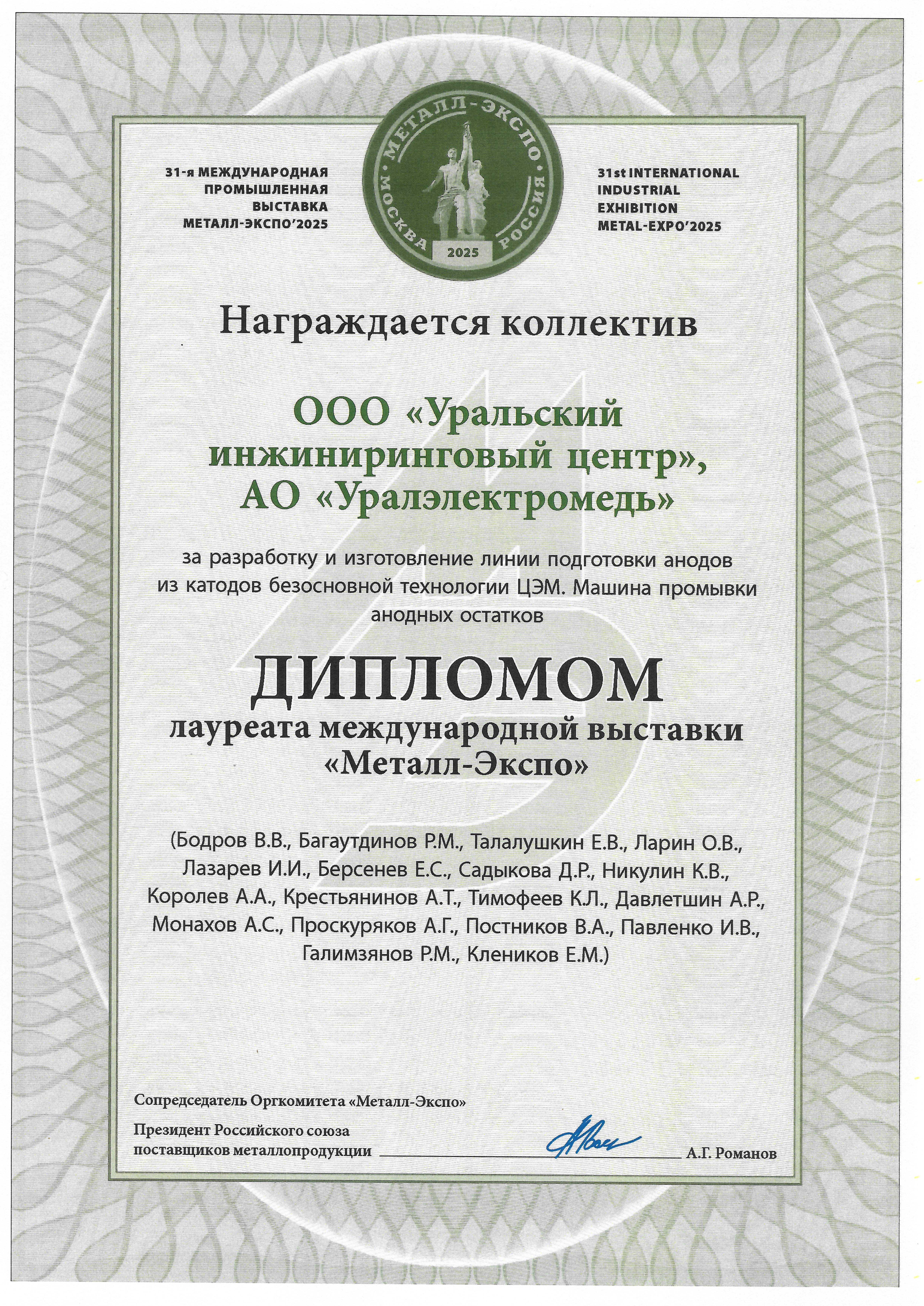 Диплом лауреата выставки за Линию подготовки анодов из катодов безосновной технологии цеха электролиза меди (далее - ЦЭМ). Машина промывки анодных остатков.