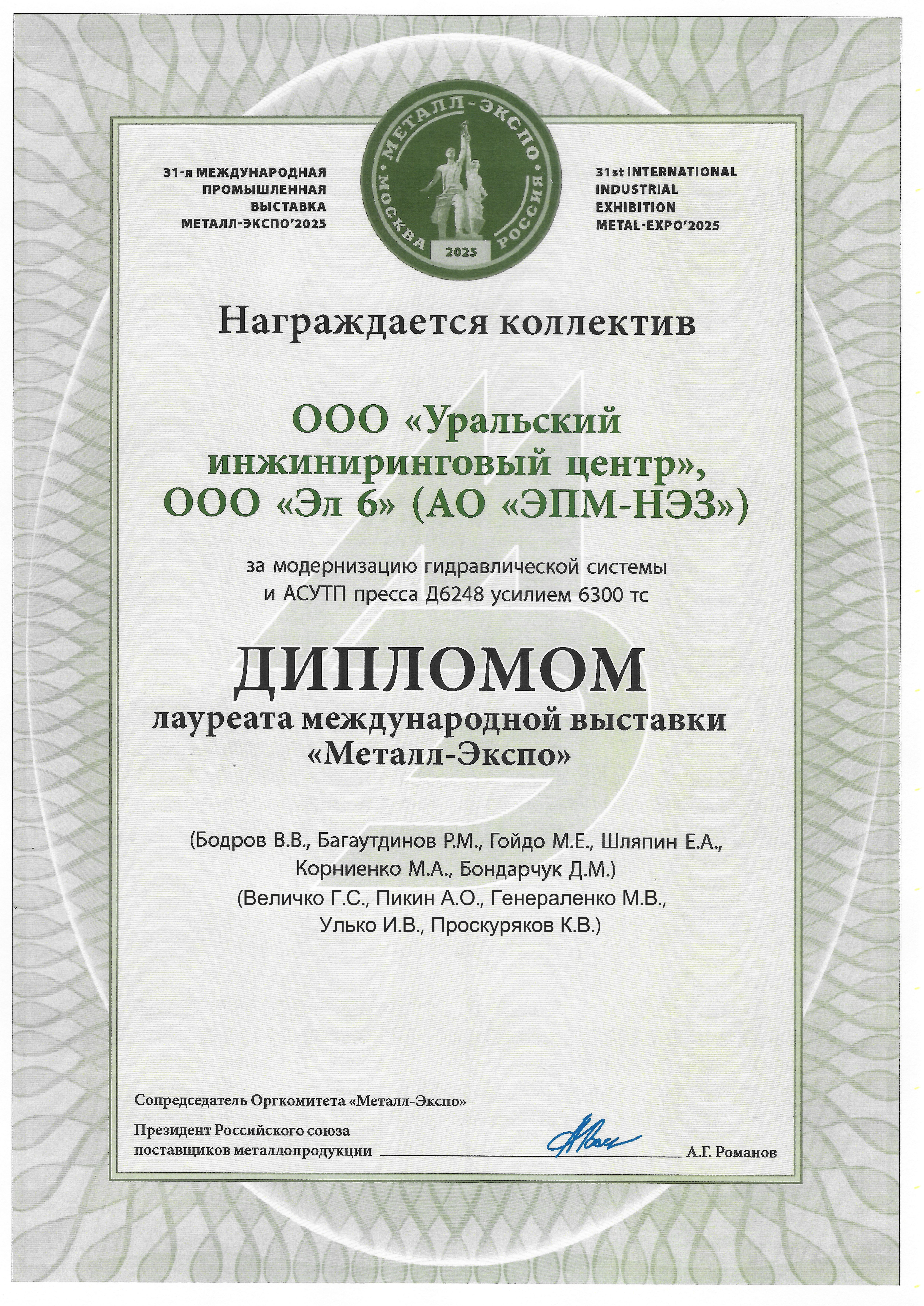 Диплом лауреата выставки за Модернизацию гидравлической системы и АСУТП пресса Д6248 усилием 6300 тс для ООО «Эл 6» (бывший АО «ЭПМ-НЭЗ»)
