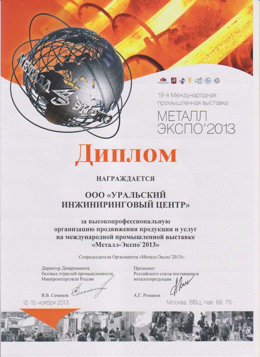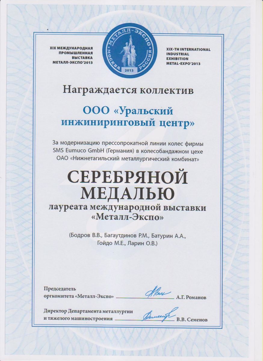 За модернизацию прессопрокатной линии колес фирмы SMS Eumuco GmbH (Германия) в колесобандажном цехе ОАО "Нижнетагильский металлургический комбинат" коллектив УрИЦ награжден СЕРЕБРЯНОЙ МЕДАЛЬЮ лауреата международной выставки Металл-Экспо. Также УрИЦ был удостоен диплома за высокопрофессиональную организацию продвижения продукции и услуг.