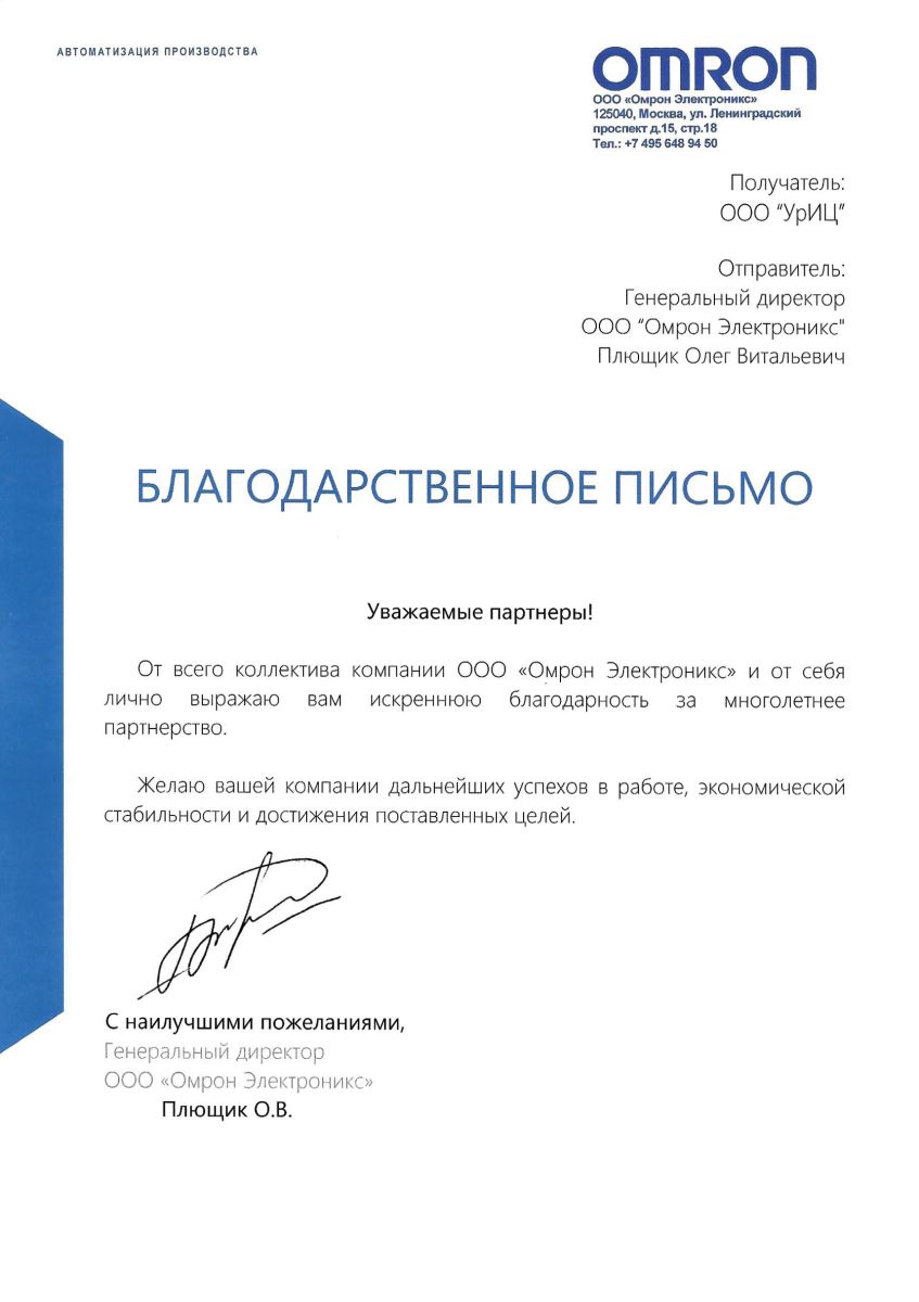 Компания УрИЦ отмечена благодарственным письмом OMRON