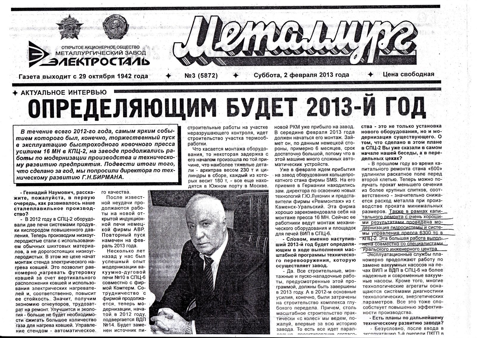 —Мнение директора по техническому развитию ОАО "Металлургический завод "Электросталь" Бирмана Г.Н. о работе, выполненной ООО "УрИЦ" "Уральский инжиниринговый центр" участвует в реновации "Электростали"