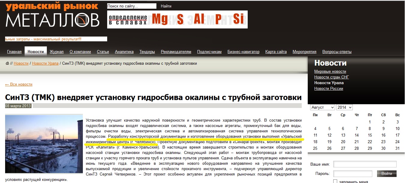 Журнал "Уральский рынок металлов" сообщает, что разработку конструкторской документации и изготовление оборудования установки для гидросбива окалины с трубной заготовки на СинТЗ выполнил «Уральский инжиниринговый центр» (г. Челябинск)